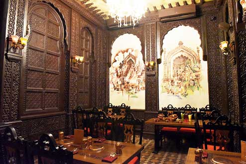 Oudh 1590 lives up — even in decor — to its period dining theme. There are three zones to dine at — the ground level seats 16 + 16 while the upper level packs in the rest in two separate zones. The decor involves swords, shields, mirrored and coloured lamps, chandeliers, patterned floor tiles and paintings of Nawabs and courtesans adorning the walls... was I on the sets of Bajirao Mastani?!
