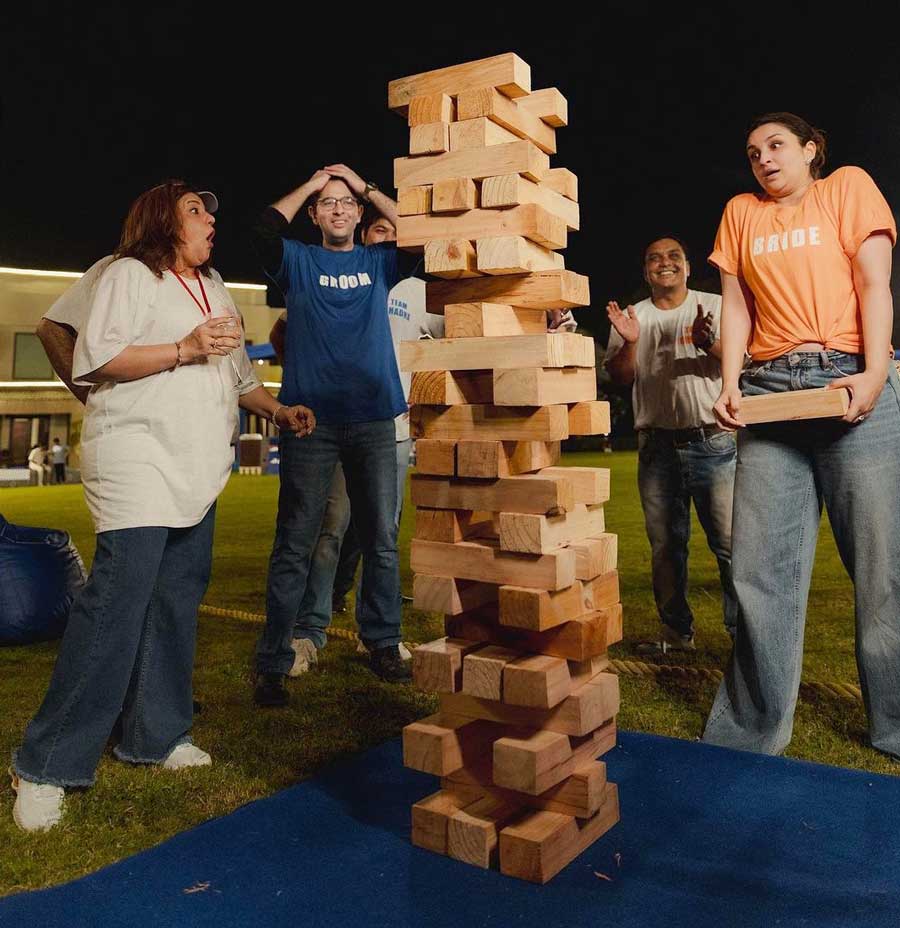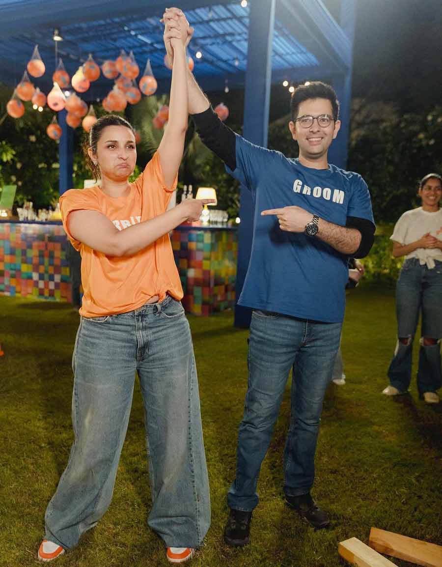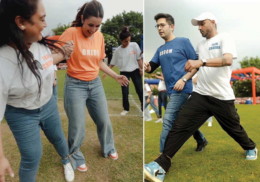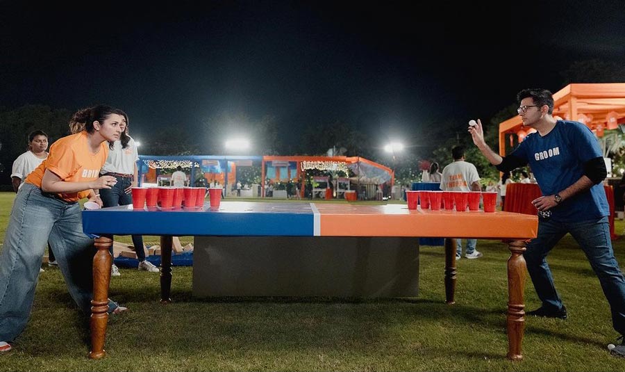 Actress Parineeti Chopra and Rajya Sabha MP Raghav Chadha organised a unique pre-wedding event which saw their families and friends challenge each other in fun games and sports ahead of their September 24 wedding. The attendees played lemon-and-spoon race, musical chairs, giant Jenga, cricket and other games at the event. Here’s a look.