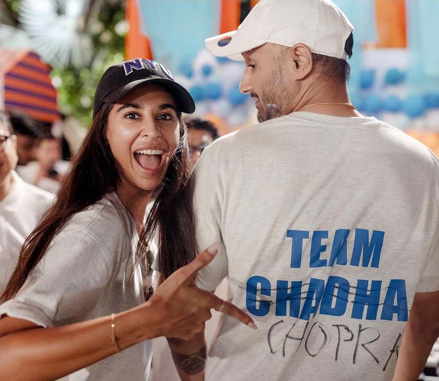 Parineeti paired up with her loved ones while Raghav paired up with Harbhajan Singh for the three-legged race.