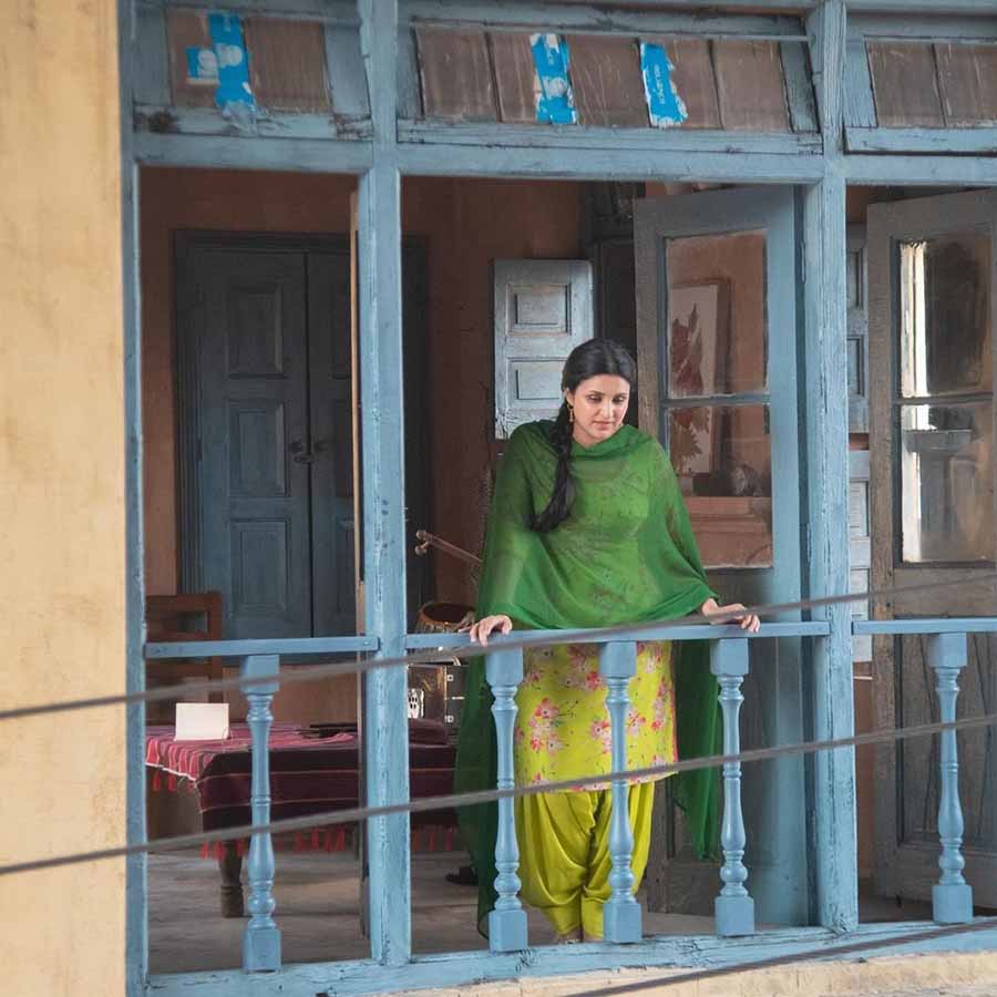Dressed in a yellow-and-green suit, Parineeti stood on a balcony to shoot a sequence for the biographical drama.