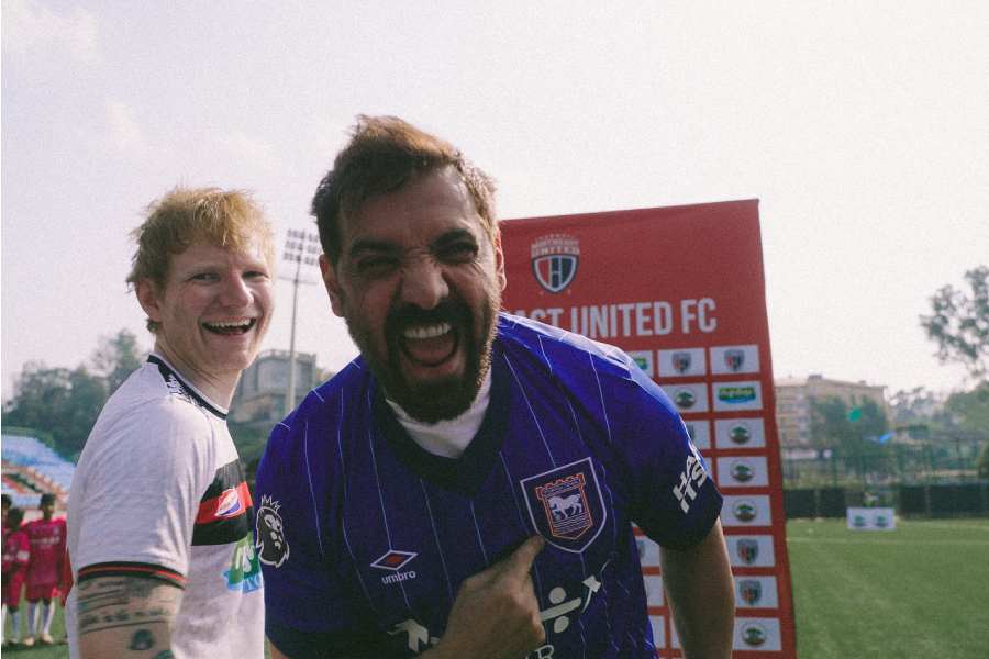 John and Sheeran cheered for football players at the stadium. “NorthEast United FC x Ed Sheeran...On this +-=÷x Tour, we’re only multiplying happiness,”NorthEast United F.C’s official Instagram page wrote alongside the photos.