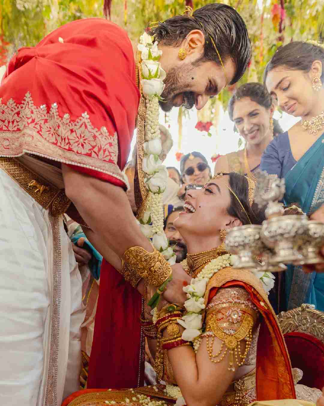 Vijay and Rashmika were all smiles as they gazed into each other’s eyes. The couple exchanged garlands as part of the wedding rituals. Vijay opted for a white dhoti, a golden waist band and a traditional red shawl.