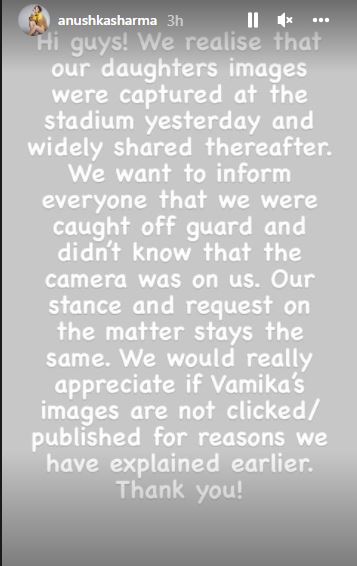 "Our stance and request on the matter stays the same. We would really appreciate if Vamika's images are not clicked/ published for reasons we have explained earlier. Thank you," Sharma wrote.