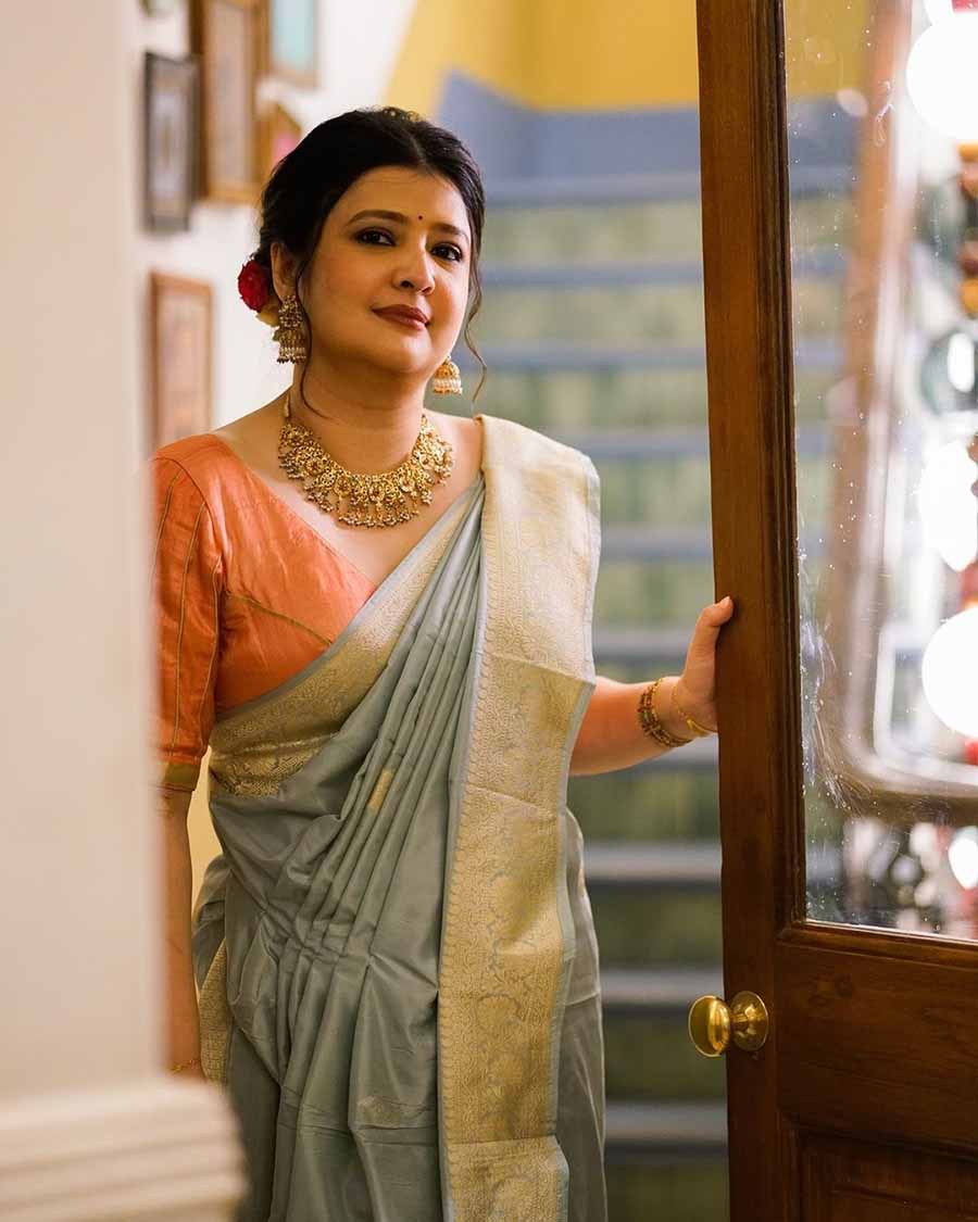 Piya chose a golden-bordered pastel grey sari for the reception party and paired it with golden jewellery.