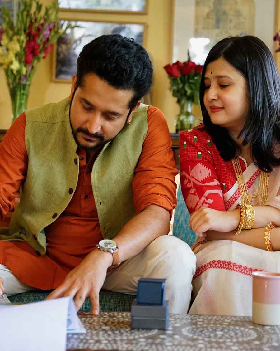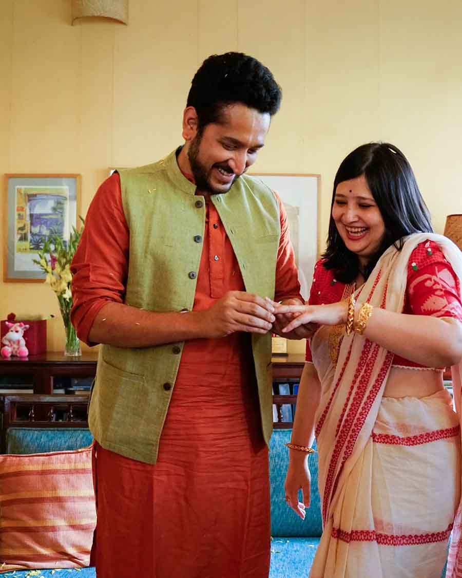 On wedding day, Parambrata donned a rust-coloured kurta with a green jacket, while Piya opted for a red-and-white sari.