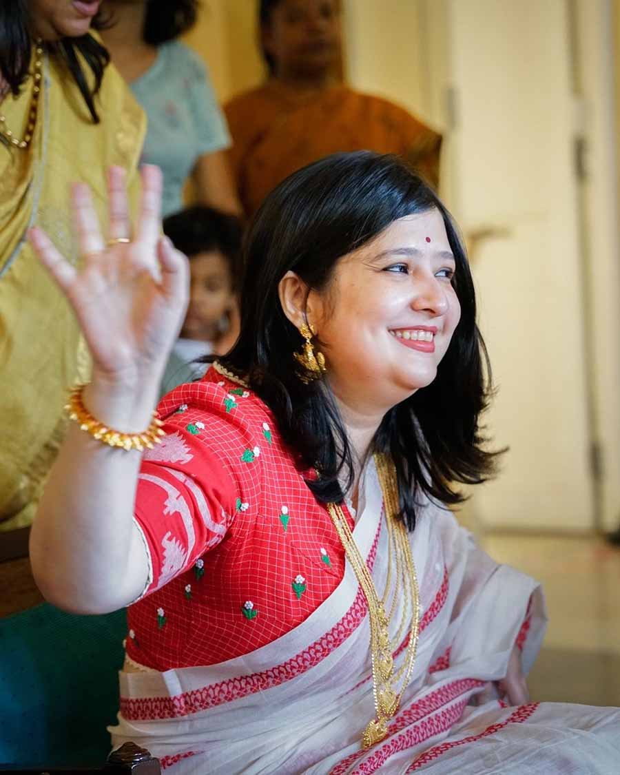 Piya looked radiant in her white-and-red sari while holding her hand up in jubilation after registration of her marriage.