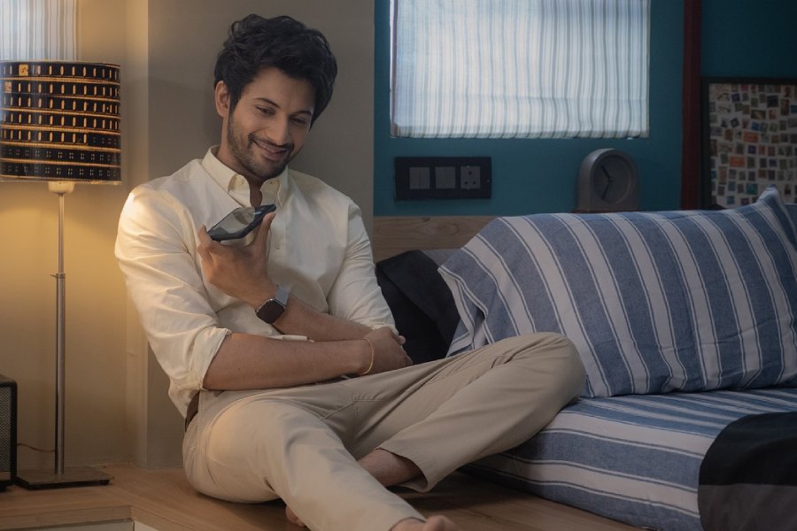 A candid photo shows Rohit’s character Rishi brimming with joy while talking on the phone.