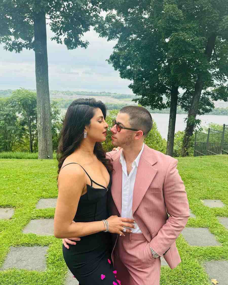 Looking dapper in a dusty pink suit, Nick embraced his wife for a romantic picture. Priyanka looked gorgeous in a black column dress and complemented her look with minimal accessories and subtle makeup. The actress also wore her hair down, flaunting her loose curls.