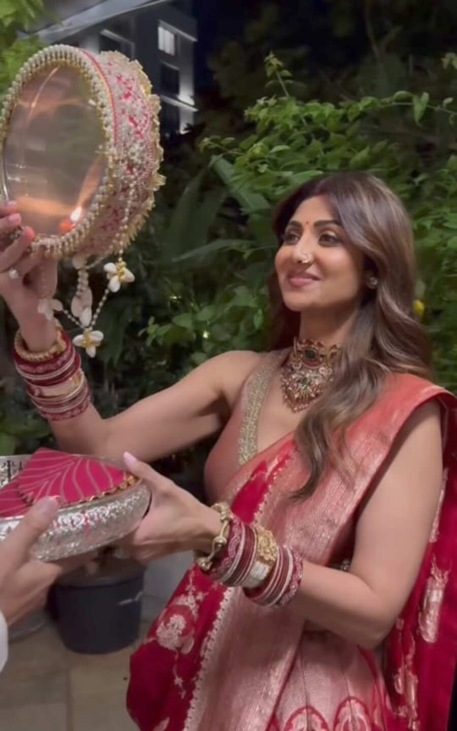 Actress Shilpa Shetty Kundra stunned in a red embroidered sari as she viewed her husband Raj Kundra through a sieve. The couple tied the knot on November 22, 2009. They have two children together — son Viaan and daughter Samisha.