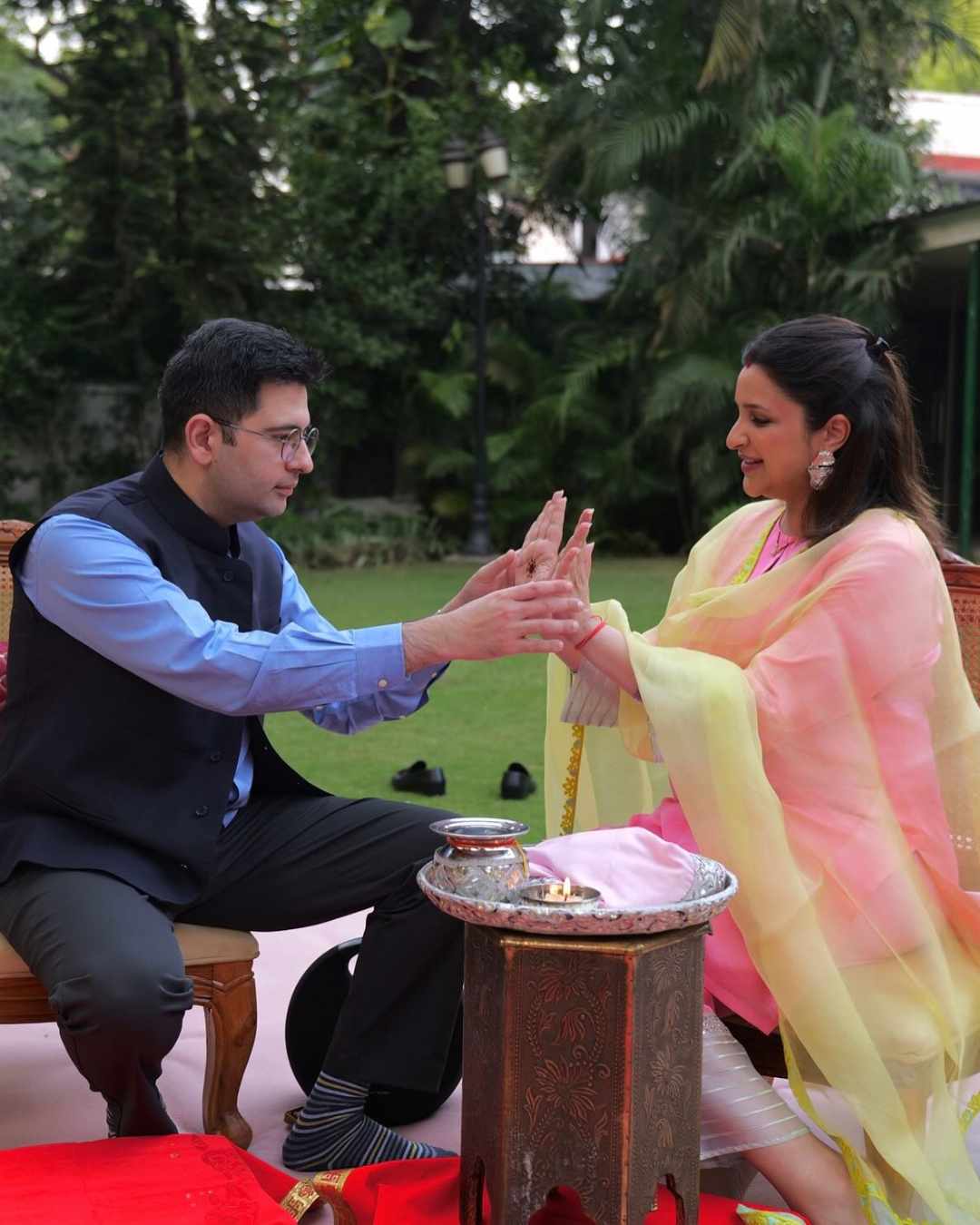 Actress Parineeti Chopra observed the day with her husband, politician Raghav Chadha. The actress posted a set of pictures of her performing the rituals. In August, the couple announced their pregnancy.