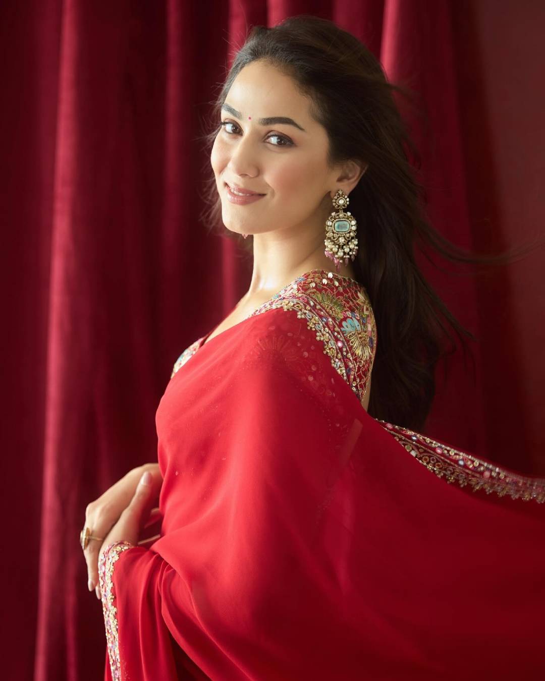 Bollywood actor Shahid Kapoor’s wife, Mira Rajput Kapoor, looked radiant in her Karwa Chauth attire, which featured a vibrant red sari paired with a multi-coloured sequinned blouse, accessorised with a pair of heavy stone-studded earrings.