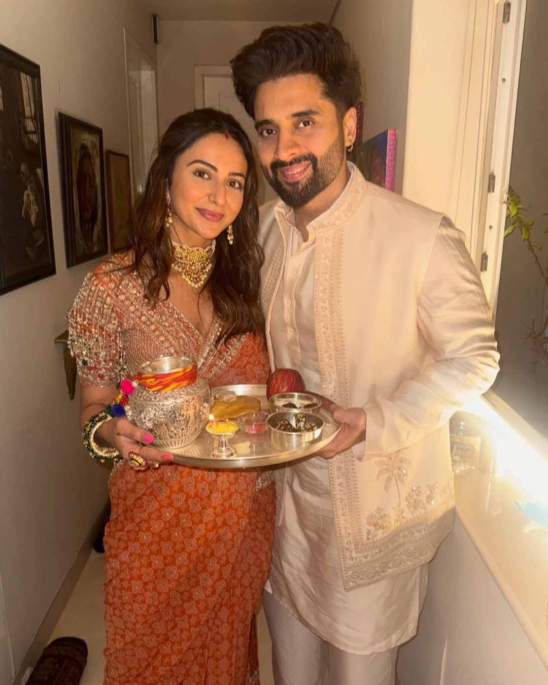 Rakul Preet Singh, who also celebrated her 35th birthday on Friday, observed Karwa Chauth with her husband, actor-producer Jackky Bhagnani. While Rakul opted for an orange-and-peach lehenga with a sculptured blouse, Jackky looked dapper in an ivory ethnic suit.