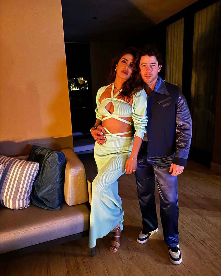The couple looked party-ready as they celebrated New Year. Priyanka wore a mint-blue strappy dress and beige heels, while Nick dressed in dark blue iridescent pants and jacket along with a pair of black and white sneakers.