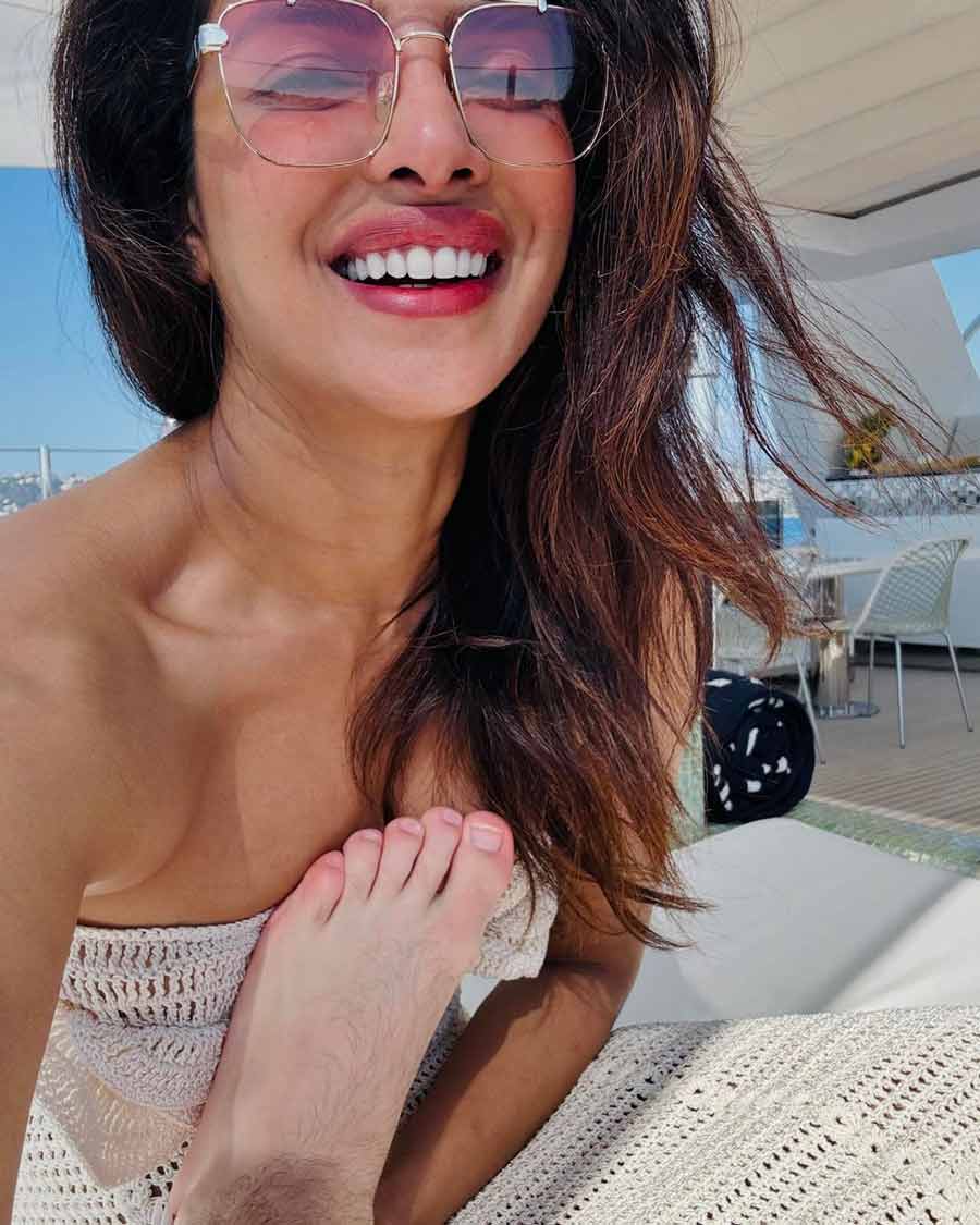 Priyanka clicked a sun-kissed selfie in a white swimsuit and quirky shades, while Nick relaxed on the deck with a blanket wrapped around his legs.