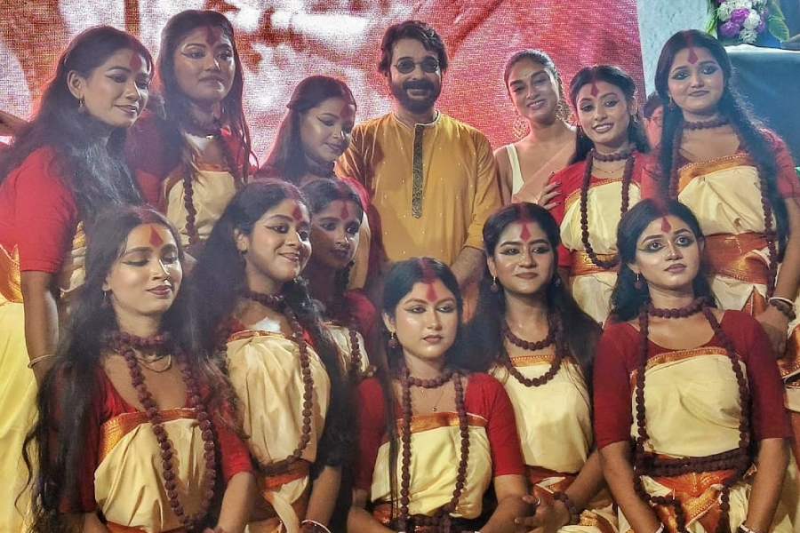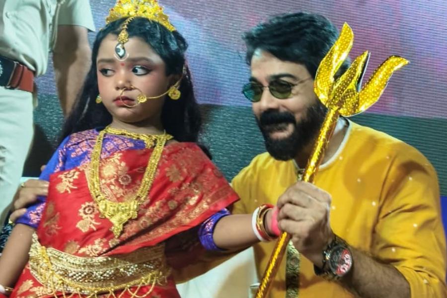Actor Prosenjit Chatterjee, who portrays Bhavani Charan Pathak in the upcoming film, was spotted posing with a kid dressed as Goddess Durga.