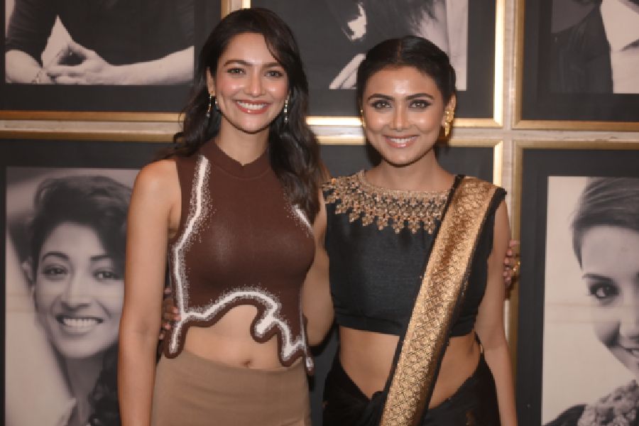 Actress Susmita Chatterjee posed with Idhika Paul, who essays the role of Moni, Raghu's love interest, in Raghu Dakat. Susmita looked gorgeous in a brown asymmetrical crop top and beige skirt, while Idhika stunned in a black-and-golden sari ensemble.