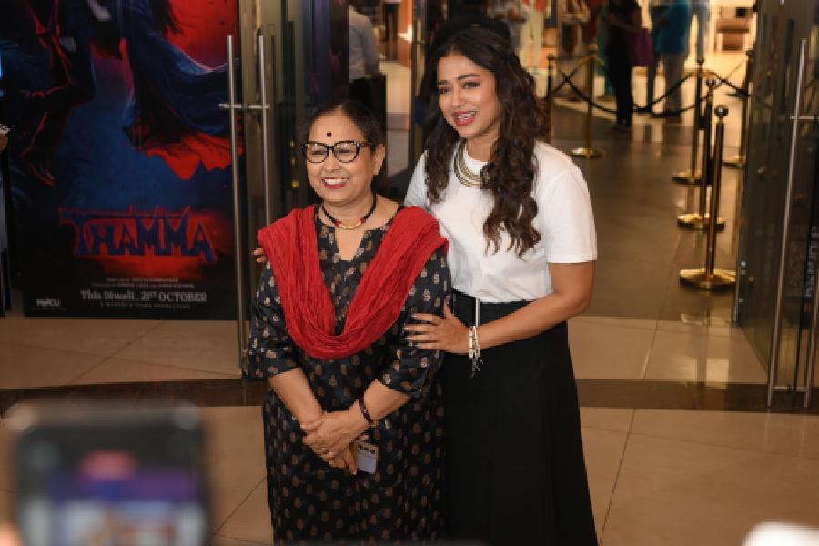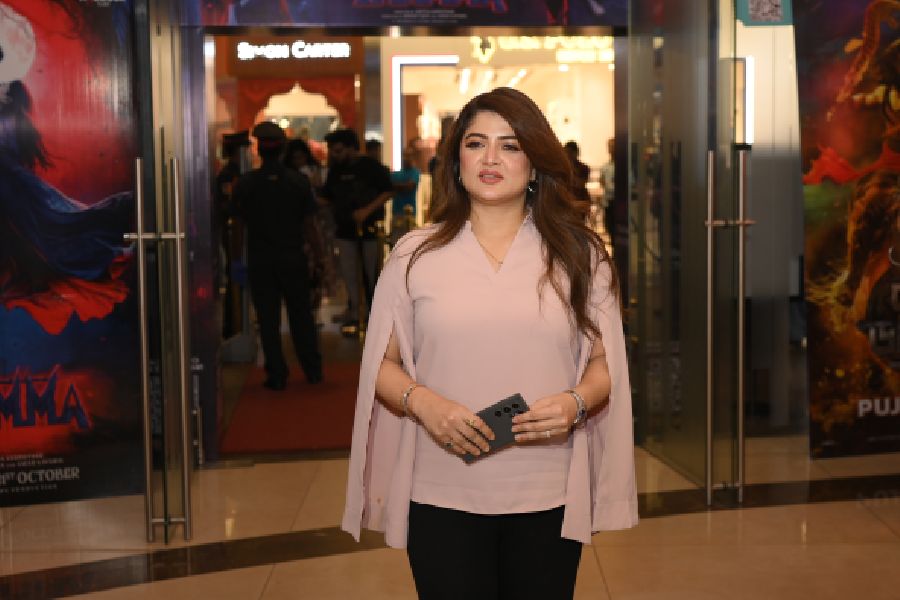 Srabanti Chatterjee, whose latest release Devi Chowdhurani clashed with Raghu Dakat at the box-office, attended the special screening in a pastel pink top and black trousers.