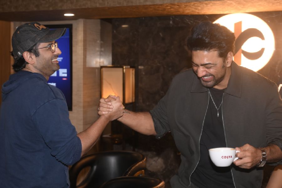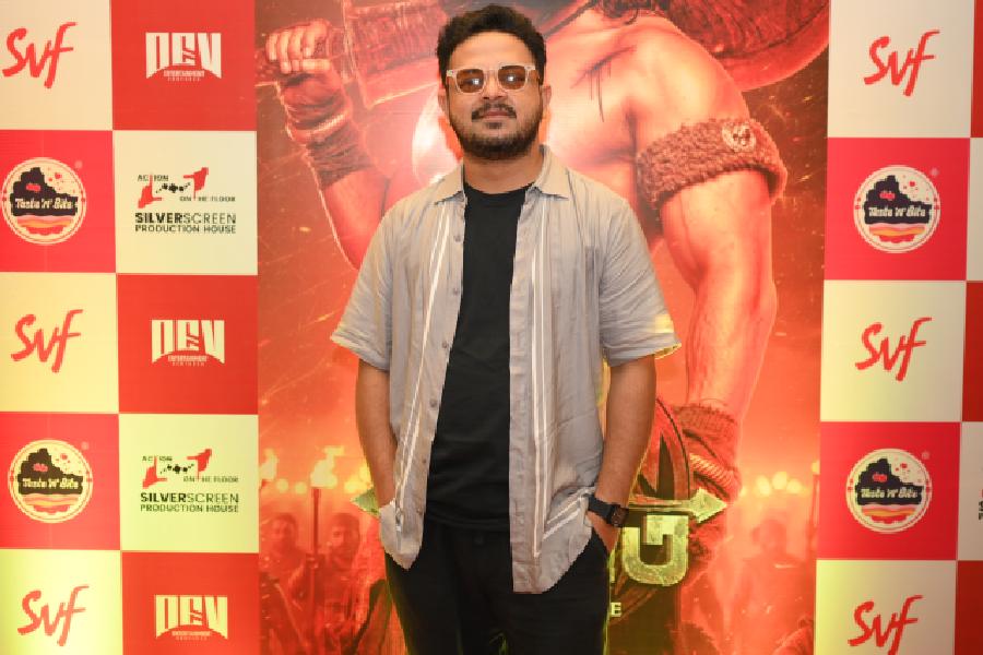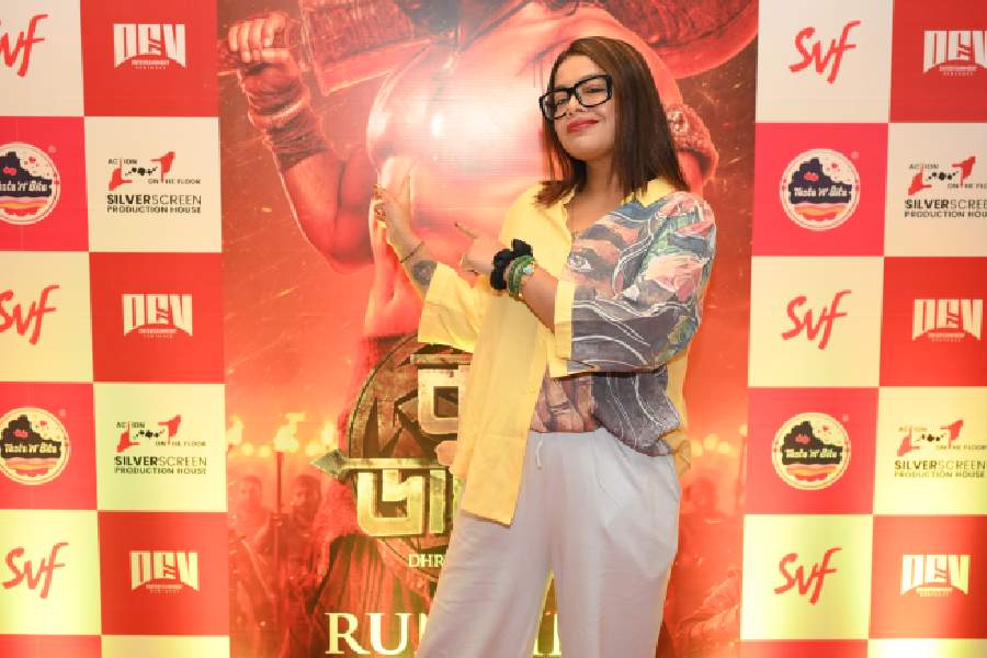 Singer Iman Chakraborty wore a graphic yellow T-shirt and grey trousers. She struck a pose in front of Raghu Dakat’s poster.