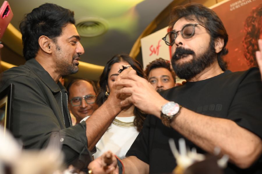 Dev, who essays the role of a vigilante warrior in Raghu Dakat, fed Prosenjit Chatterjee a piece of the celebratory cake. Dev and Prosenjit had last worked together in the 2022 film Kachher Manush.