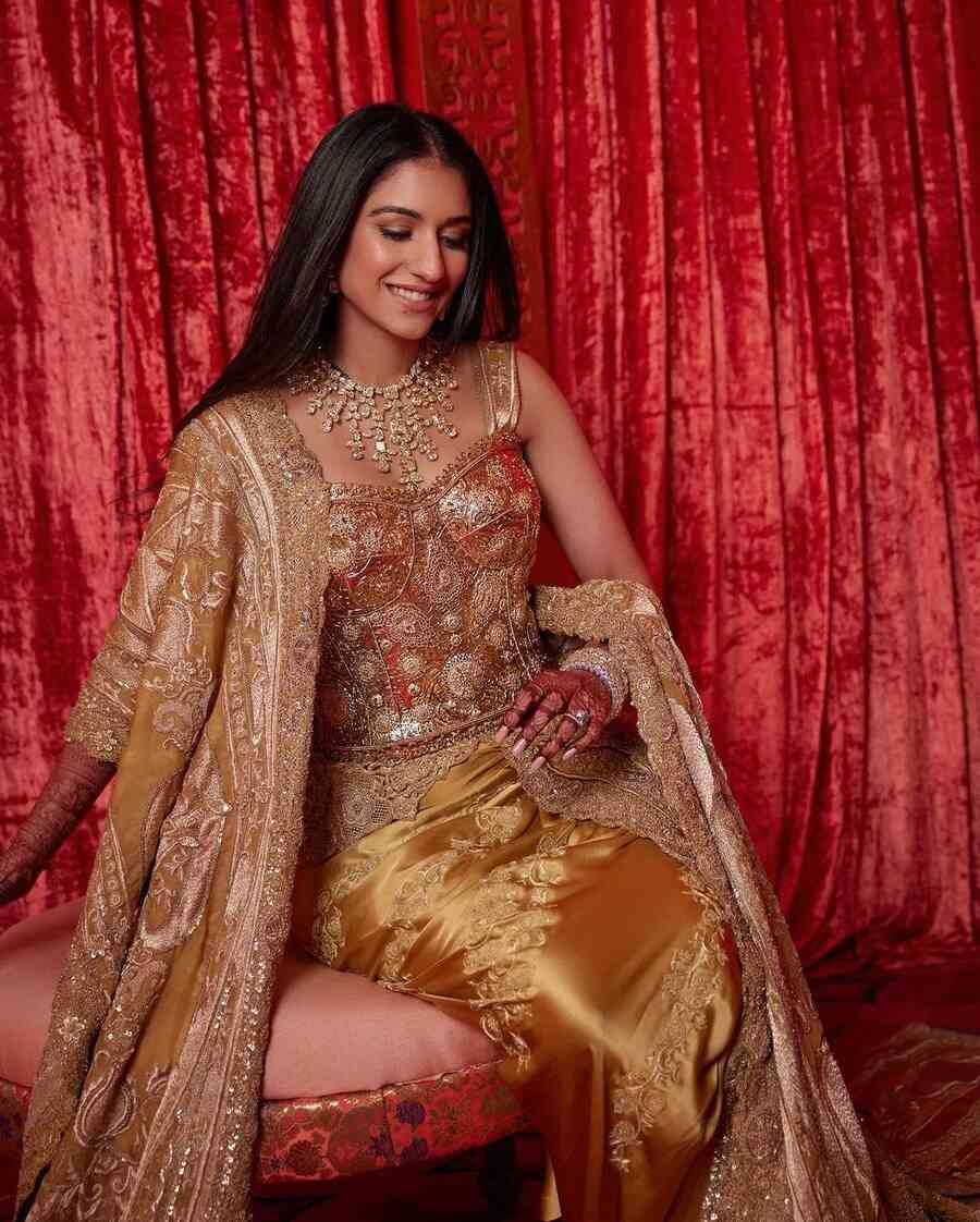 The golden ensemble featured a corset-fit bodice and an embellished pallu draped over the right shoulder. The skirt of the gown was embroidered with floral motifs.
