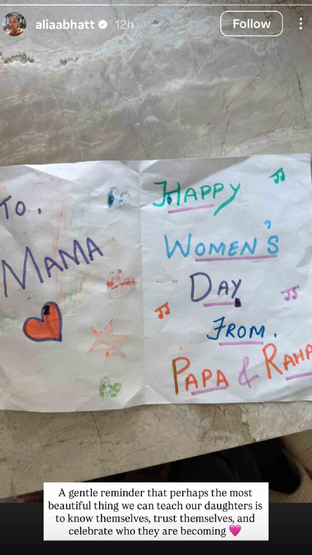 Taking to Instagram Stories, Alia posted a photo of the card. “To Mama, Happy Women’s Day. From Papa & Raha,” was the message written on it.