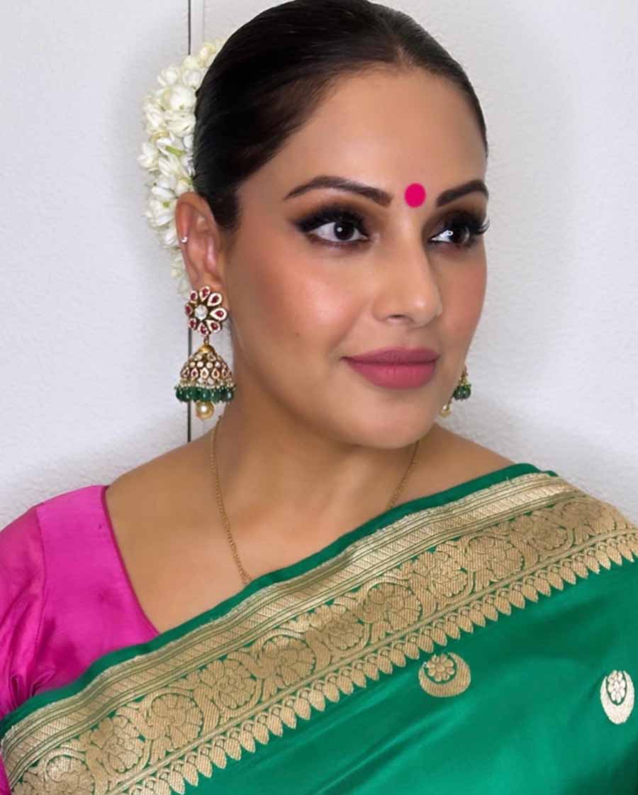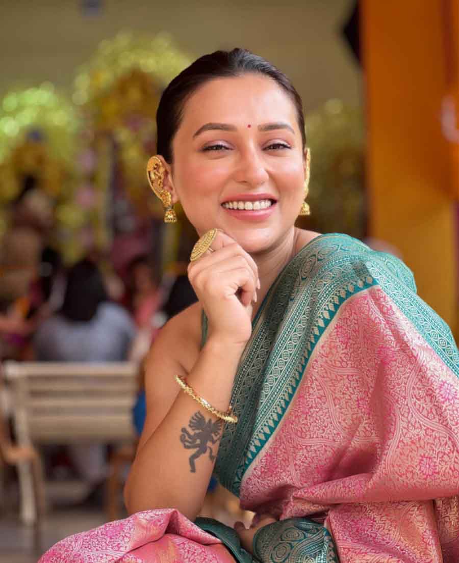 Raktabeej actress Mimi Chakraborty, who was mostly seen celebrating with family members throughout the festival, looked radiant in minimal makeup. She let her traditional ear cuff do the talking.