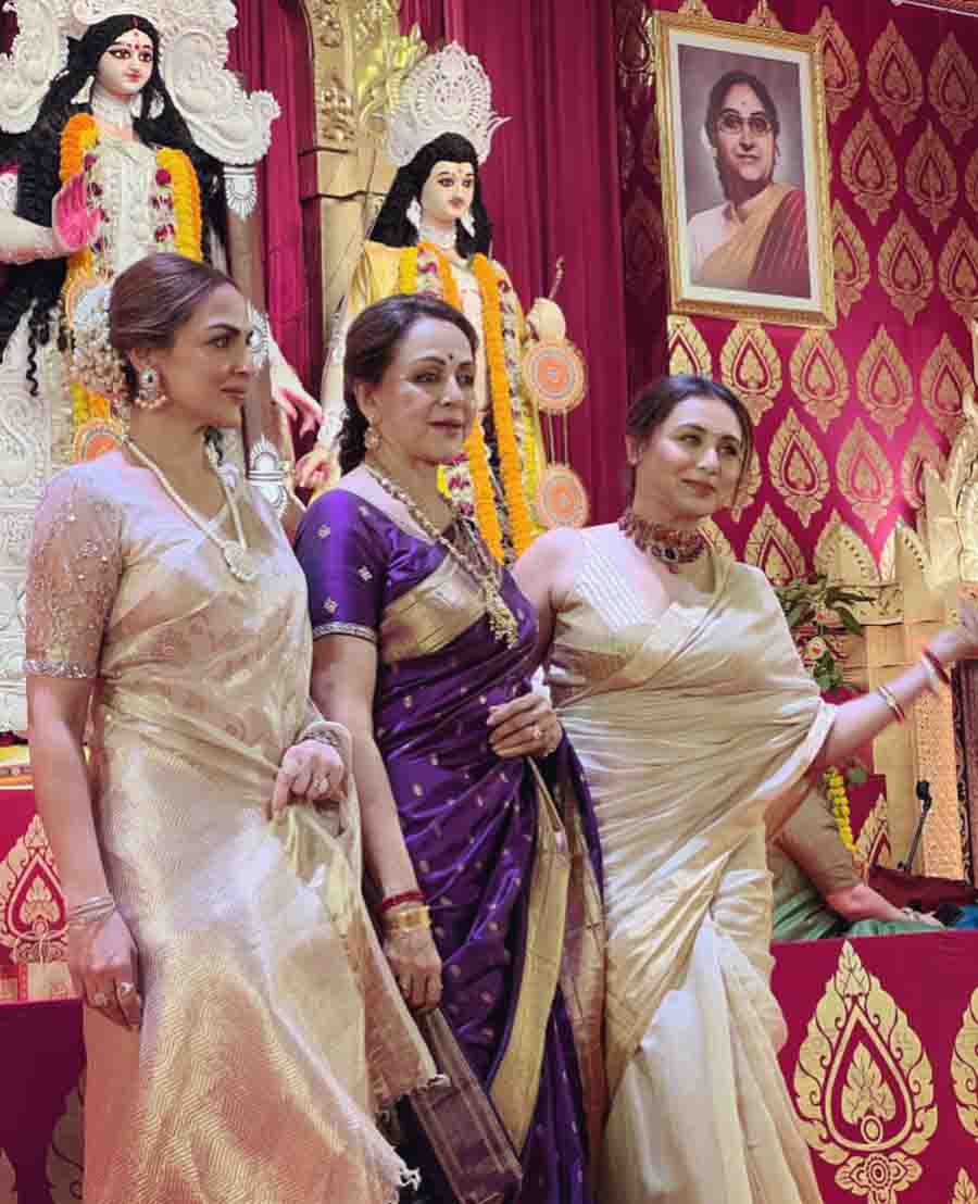 Esha Deol visited the North Bombay Durga Puja pandal along with mum Hema Malini and caught up with Rani Mukerji to exchange pleasantries. “Saptami puja and bhog today at my dear Rani’s with my mum … absolutely divine. Navratri blessings to all,” read Esha’s caption on Instagram.