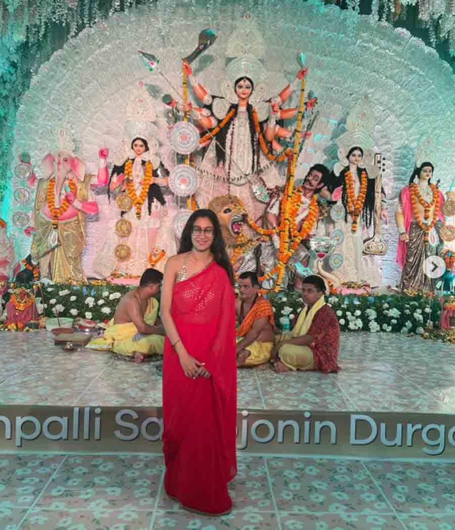 On the day of Ashtami, Sushmita Sen’s elder daughter Renee visited a Durga Puja pandal in Mumbai with family members. Her younger sister Alisah clicked her pictures while she posed in a red sari paired with a halter neck blouse.