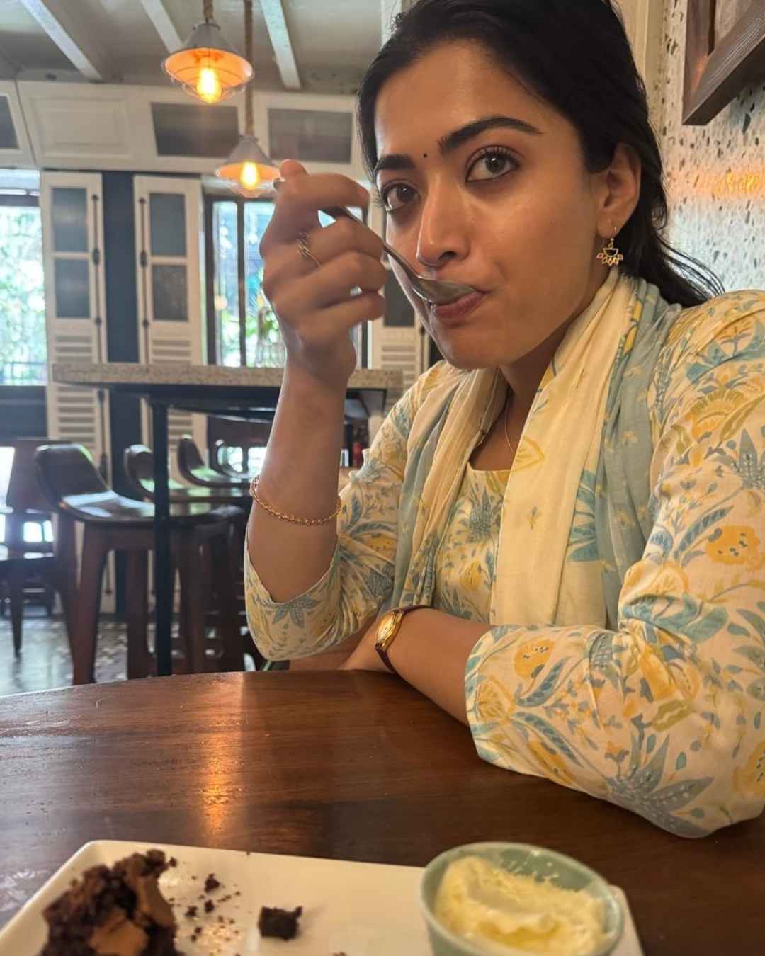 Rashmika took some time for herself and indulged in a plate of brownies and ice cream in between shots.