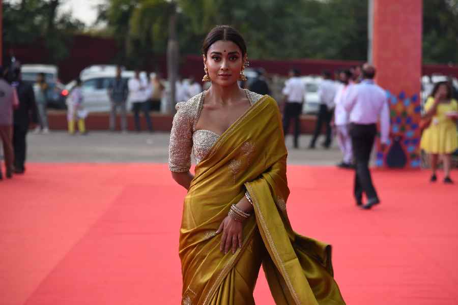 RRR actress Shriya Saran paired her golden sari with an embellished blouse. She tied her hair into a sleek bun and opted for danglers and a bindi to complete her look. Shriya spoke about the growing presence of women on film sets, not just in front of the camera but also behind it.
