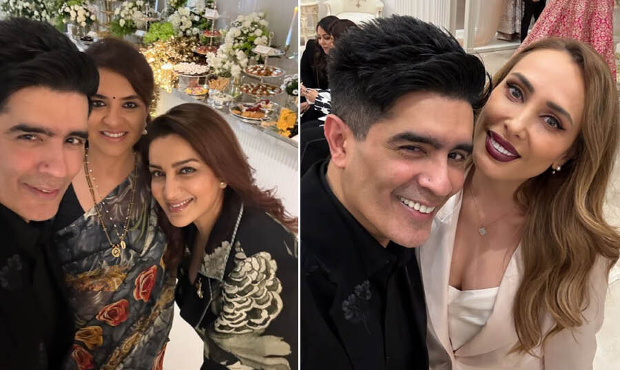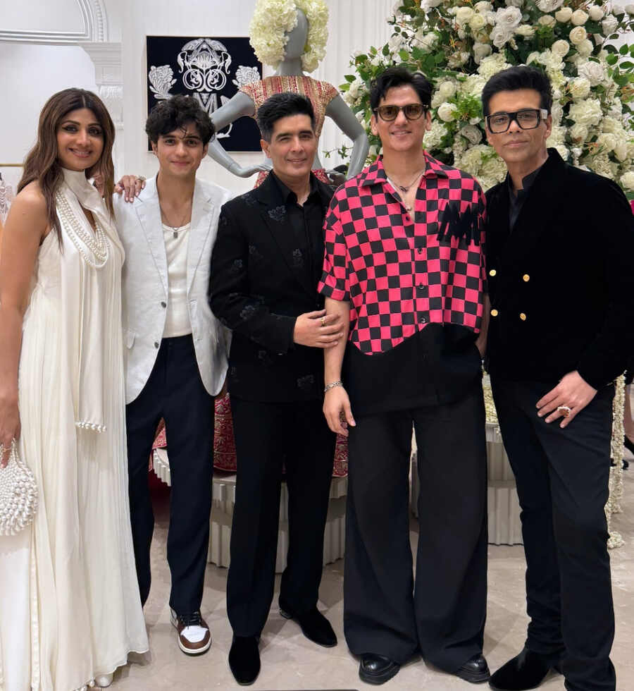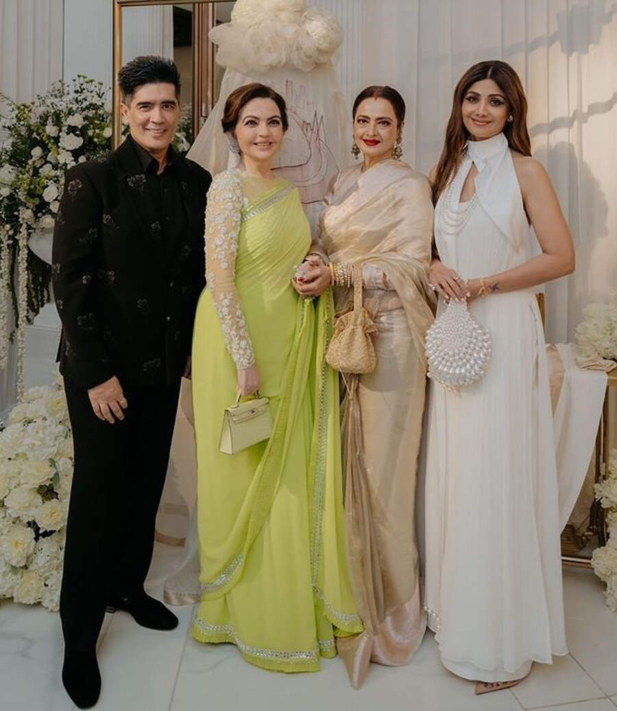 Couturier Manish Malhotra posed for the lens with Nita Ambani, Rekha and Shilpa Shetty. Nita stunned in an embroidered neon green sari, while Rekha turned heads in a radiant golden sari. Shilpa dazzled in a chic white maxi dress.