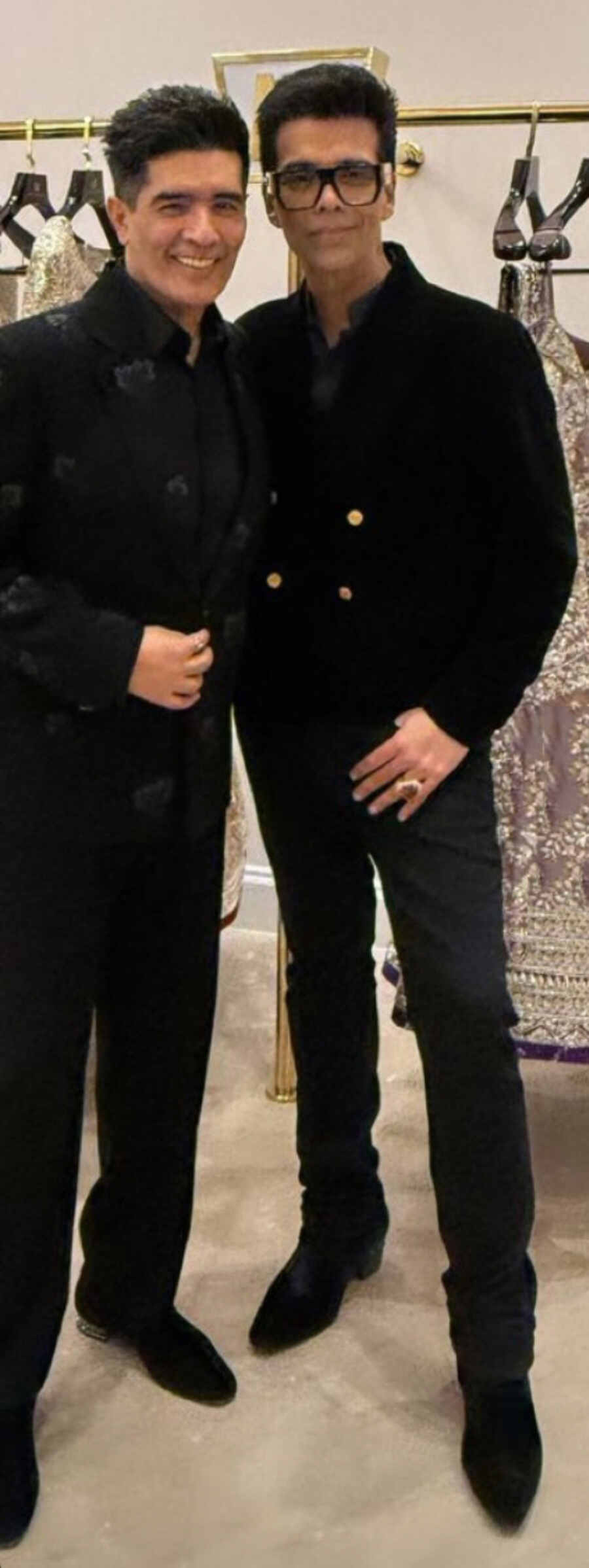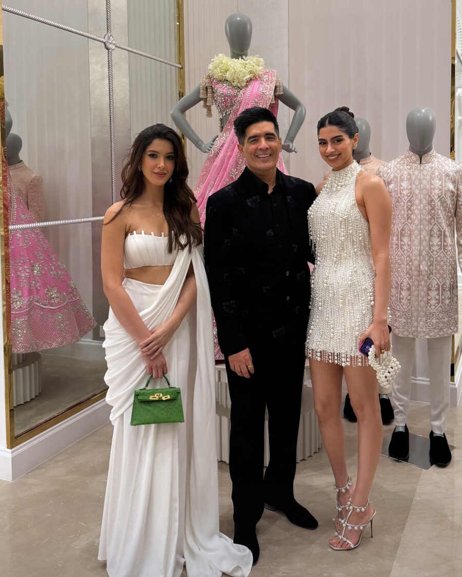 Flanked by Shanaya Kapoor and Khushi Kapoor, Manish looked dapper in a black suit. Childhood friends Shanaya and Khushi twinned in white, presenting a striking contrast to Manish’s ensemble.