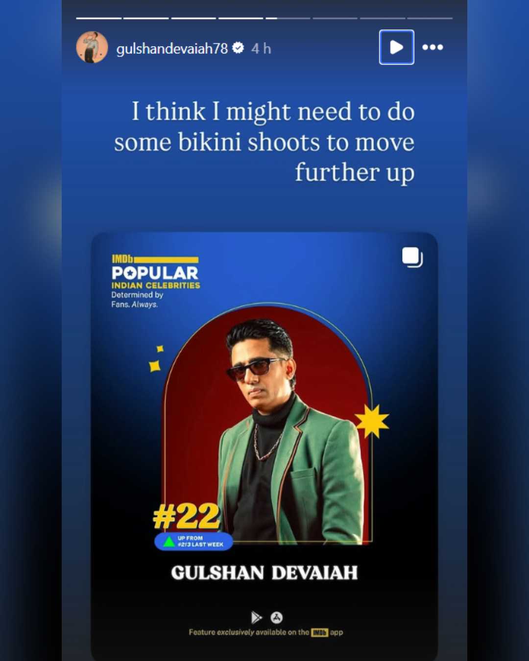 Devaiah, who moved up from 213rd rank to 22, shared a screenshot of IMDb’s post and joked, “I think I might need to do some bikini shots to move further up.”