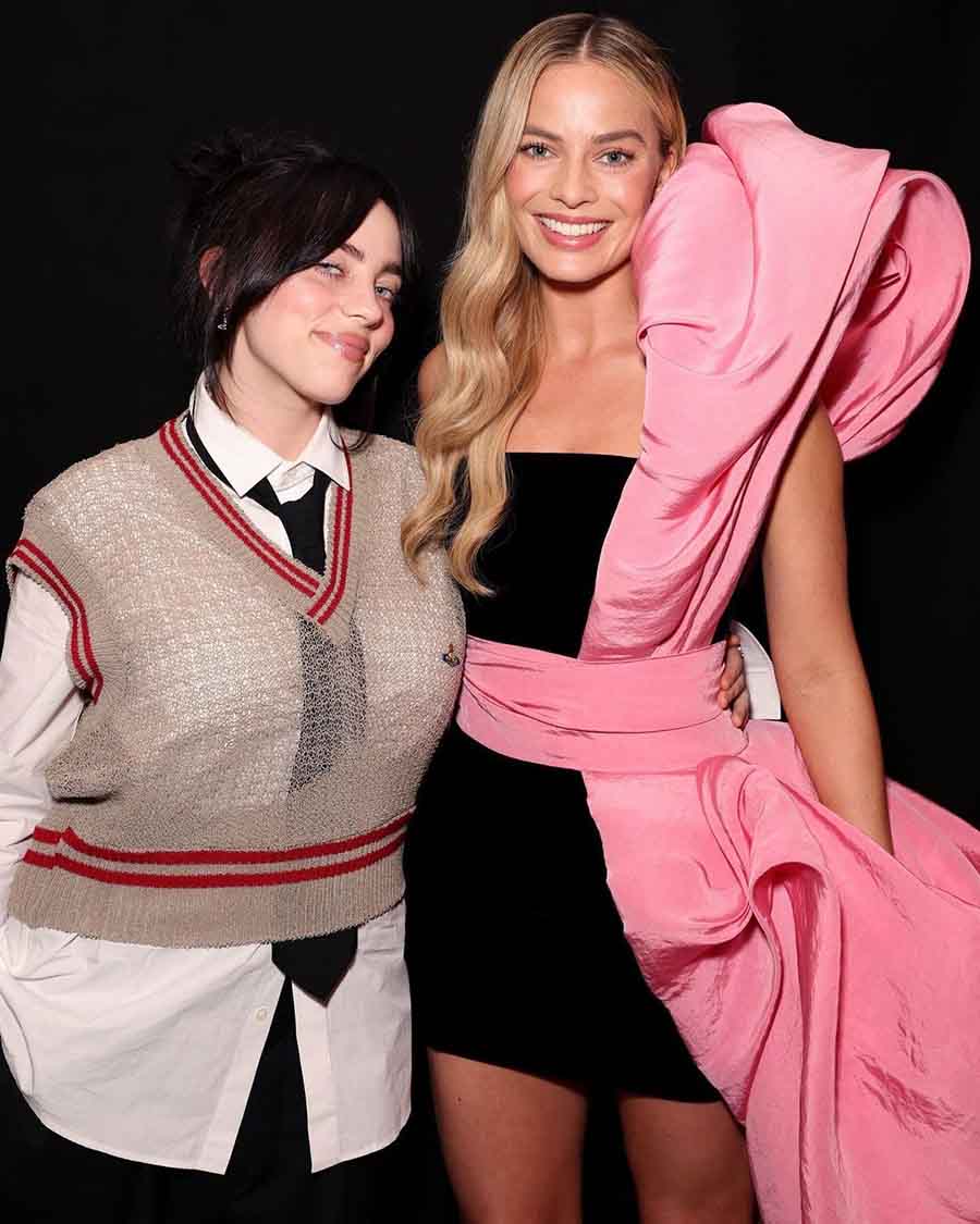 The latest in Margot Robbie’s long list of Barbie-inspired outfits is a black Schiaparelli couture mini dress with an elaborate pink sash over the left shoulder. At the ceremony, Robbie posed with What Was I Made For singer Billie Eilish, who sported a beige-and-red sweater vest over an oversized white shirt.