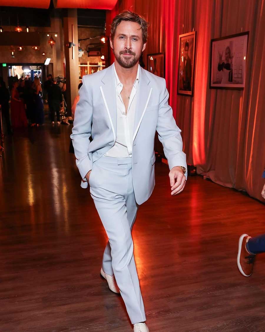 Nominated for best supporting male actor at the SAG Awards for his portrayal of Ken in Greta Gerwig’s Barbie, Ryan Gosling attended the event in a pale blue suit. He ditched the tie and wore his white shirt unbuttoned, with white oxford shoes.