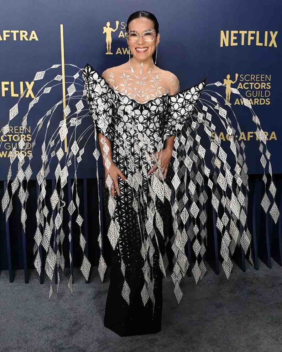 Ali Wong, who won Best Actress in a Television Movie or Limited Series for Netflix's comedy drama Beef, grabbed eyeballs in an off-shoulder black-and-white column gown with geometric motifs that covered the embellished tulle mock neck. The standout feature of her outfit was a pair of enormous wings made of protruding cords embellished with diamond-shaped cutouts.