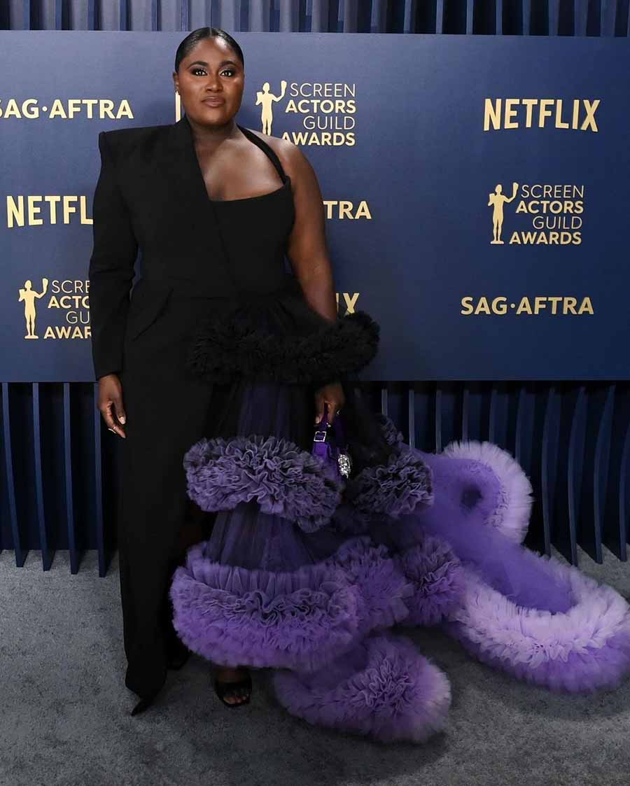 Danielle Brooks’ part-tuxedo part-gown ensemble featuring an ombre hemline was a nod to her last film The Colour Purple. Fuzzy purple frills made for an opulent train, complemented by her matching handbag. A sleek bun and smokey eyes accentuated Brooks’ outfit.