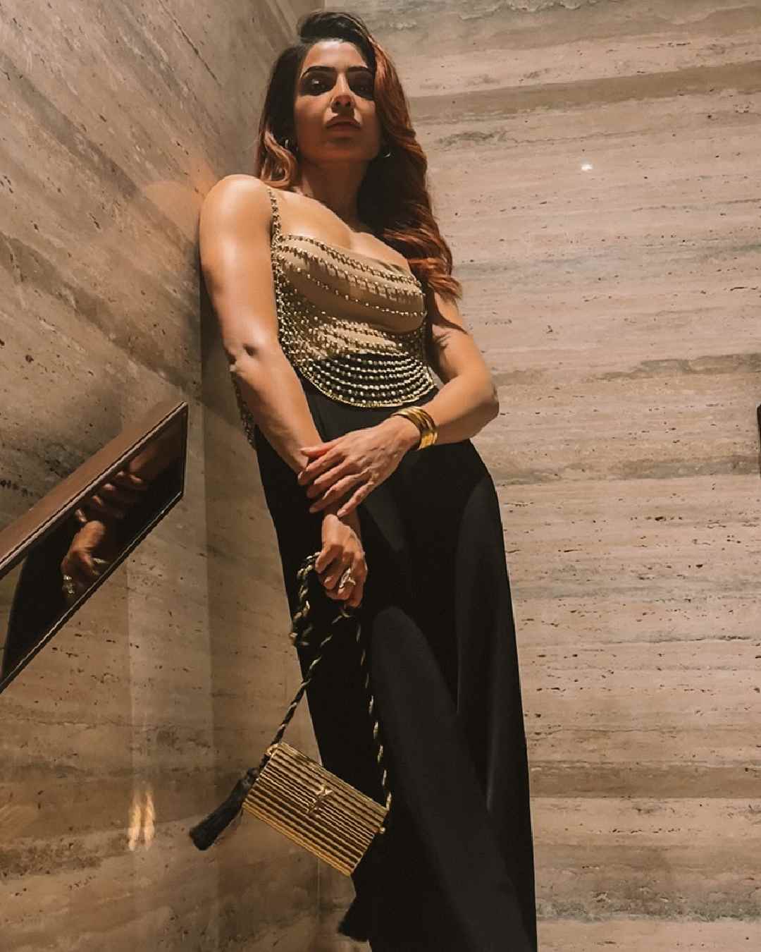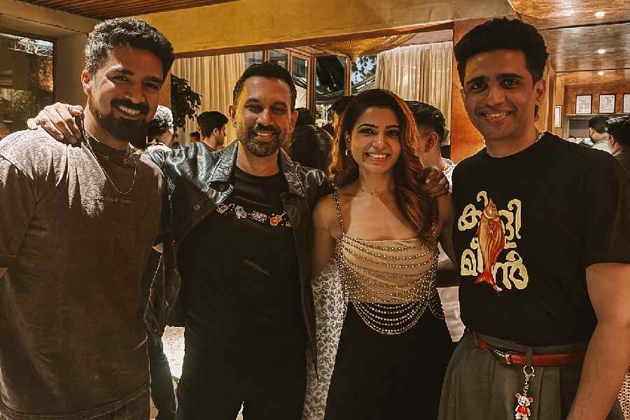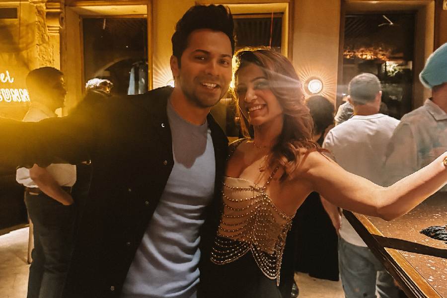 While Samantha dazzled in a golden pearl-studded top paired with black trousers, Varun kept it casual in a black blazer worn over a pale blue sweatshirt and beige trousers. “A beautiful evening spent with the loveliest people, my heart overflowing with gratitude,” Samantha captioned the pictures on Instagram.