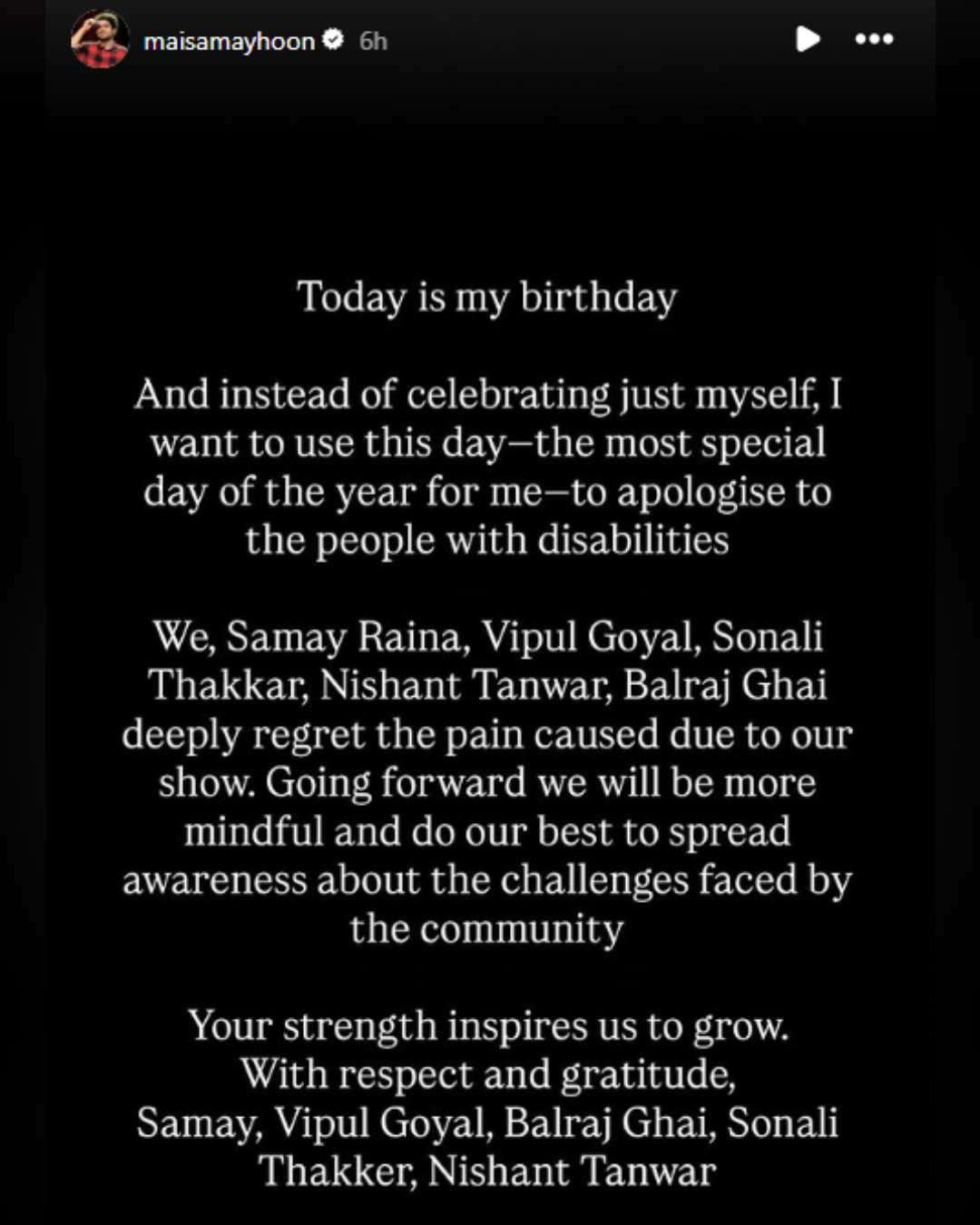 “We, Samay Raina, Vipul Goyal, Sonali Thakkar, Nishant Tanwar, Balraj Ghai, deeply regret the pain caused due to our show. Going forward, we will be more mindful and do our best to spread awareness about the challenges faced by the community. Your strength inspires us to grow. With respect and gratitude, Samay, Vipul Goyal, Balraj Ghai, Sonali Thakkar, Nishant Tanwar,” he added.