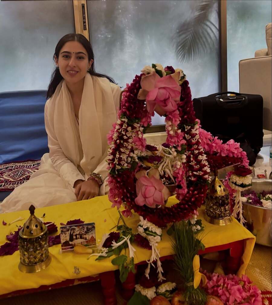 Sara started the day by performing puja at home in the morning. She chose to wear a simple white salwar suit with minimal makeup for the occasion.