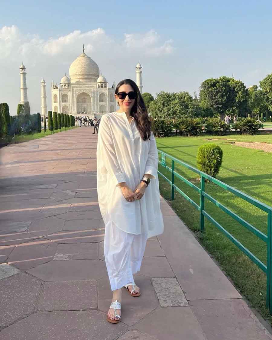 Murder Mubarak actress Karisma Kapoor sported a chic look in a white cotton two-piece suit matched with kolhapuri chappals during a day out.