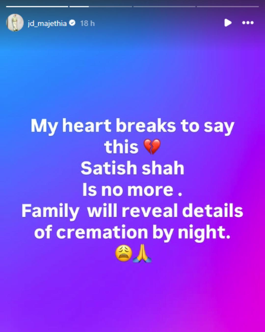 Sarabhai Vs Sarabhai creator JD Majethia took to his Instagram stories and wrote, “My heart breaks to say this. Satish Shah is no more. Family will reveal details of cremation by tonight.”