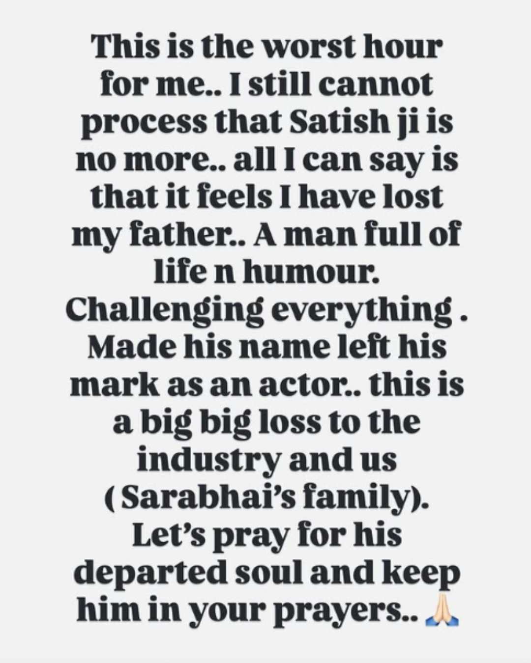 Rajesh Kumar, who portrayed the fan-favourite Rosesh, the younger son of Shah's Indravadan, said, “This is the worst hour for me.. I still cannot process that Satish ji is no more.. All I can say is that it feels like I have lost my father.. A man full of life and humour. Challenging everything. His name left his mark as an actor.. This is a big big loss to the industry and us (Sarabhai's family). Let's pray for his departed soul and keep him in your prayers.”