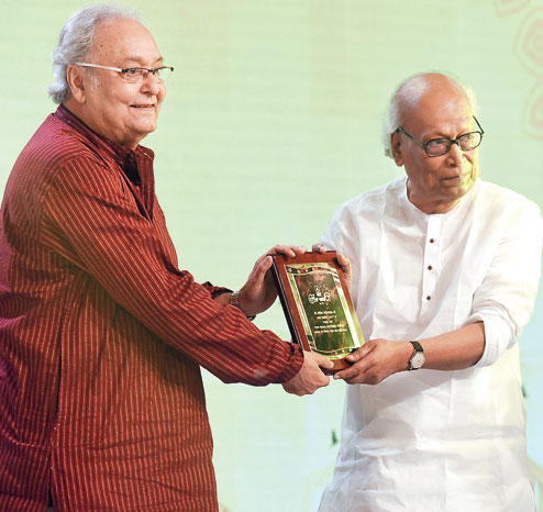 The highest honour for the evening was reserved for Soumitra Chatterjee. The Tollywood legend received the Serar Sera award from Sankha Ghosh as the audience rose to its feet at ABP Ananda Sera Bangali 2017, presented by Camellia Group, Siddha Group, Peerless, Ayuvedam Natural Cosmetics, and partnered by The Telegraph, with Senco Gold & Diamonds as the trophy partner, at The Oberoi Grand on Saturday evening. “You might not believe it but I still feel nervous when I am asked to give a speech,” said Ray’s favourite actor after Suman De, co-host for the evening, requested him for a few words. “Just like a lengthy practice takes you closer to perfection, a long time in the same field also threatens to make it monotonous and create a vacuum. However, over the years, I have fought these emotions to continue with my craft. Whatever love I have received over the years is from the people and while I am overwhelmed by it, I hope to also give it back to you all through my work,” concluded the stage-and-screen veteran.