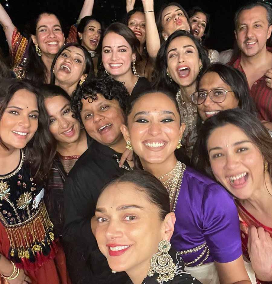 Heeramandi actress Aditi Rao Hydari, who attended the party in a black and silver suit, looked to be in high spirits as she posed for a groupfie with the hosts and the who’s who at the party.