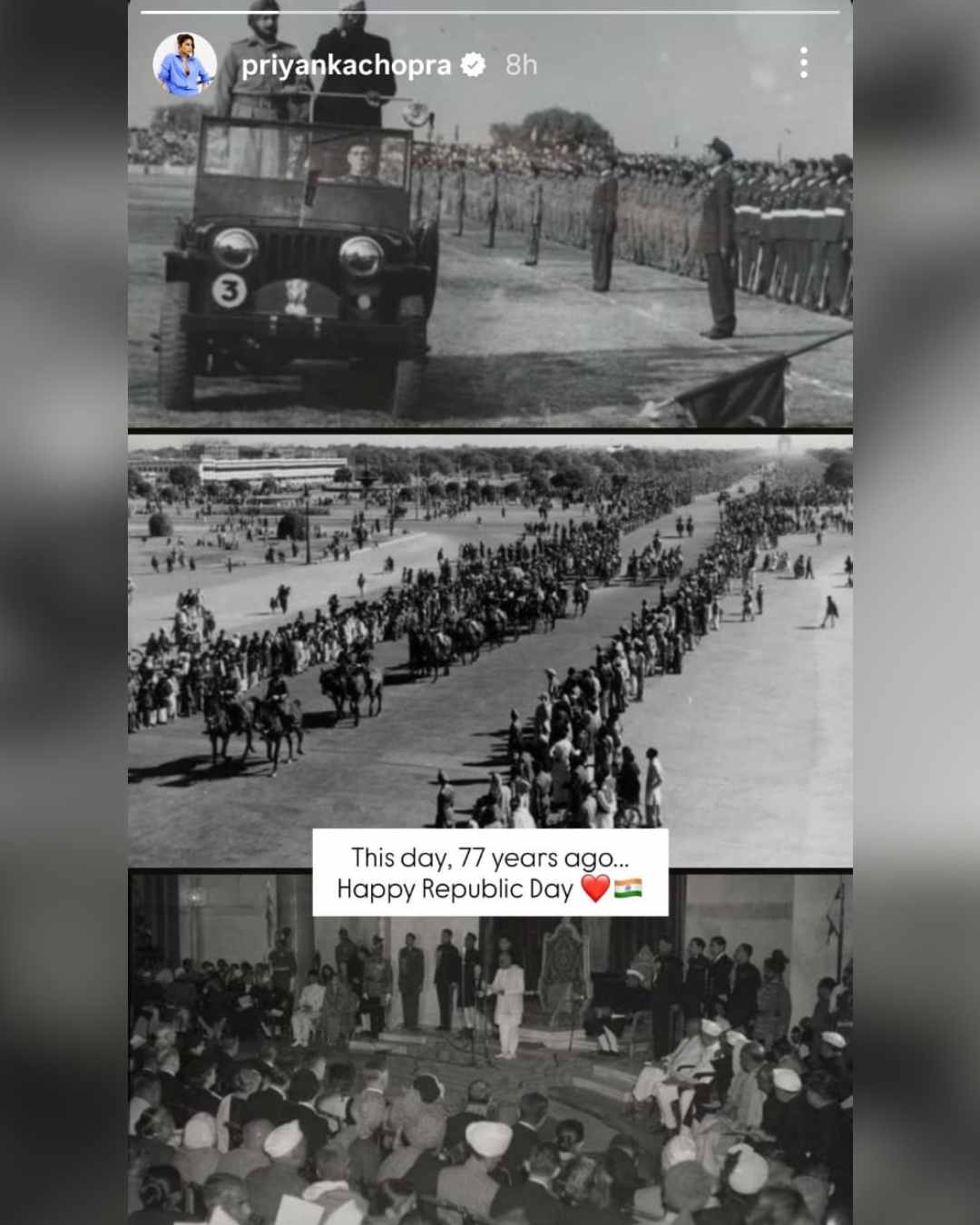 Actress Kareena Kapoor Khan shared a picture of the Indian national flag with the caption, “Happy Republic Day.” “This day...77 years ago. Happy Republic Day,” wrote Citadel star Priyanka Chopra Jonas, sharing a photograph from the annals of history on her Instagram Story.