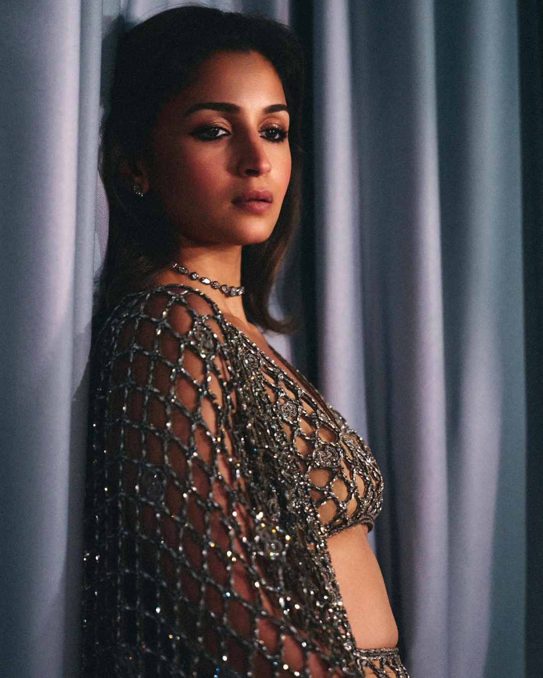 Styled by Rhea Kapoor, the outfit comprised a nude base, a plunging V-necked blouse, and a floor-sweeping drape with Swarovski crystals encrusted in a GG monogrammed mesh sari. Nude makeup and minimal accessories balanced Alia’s look on the Cannes red carpet.