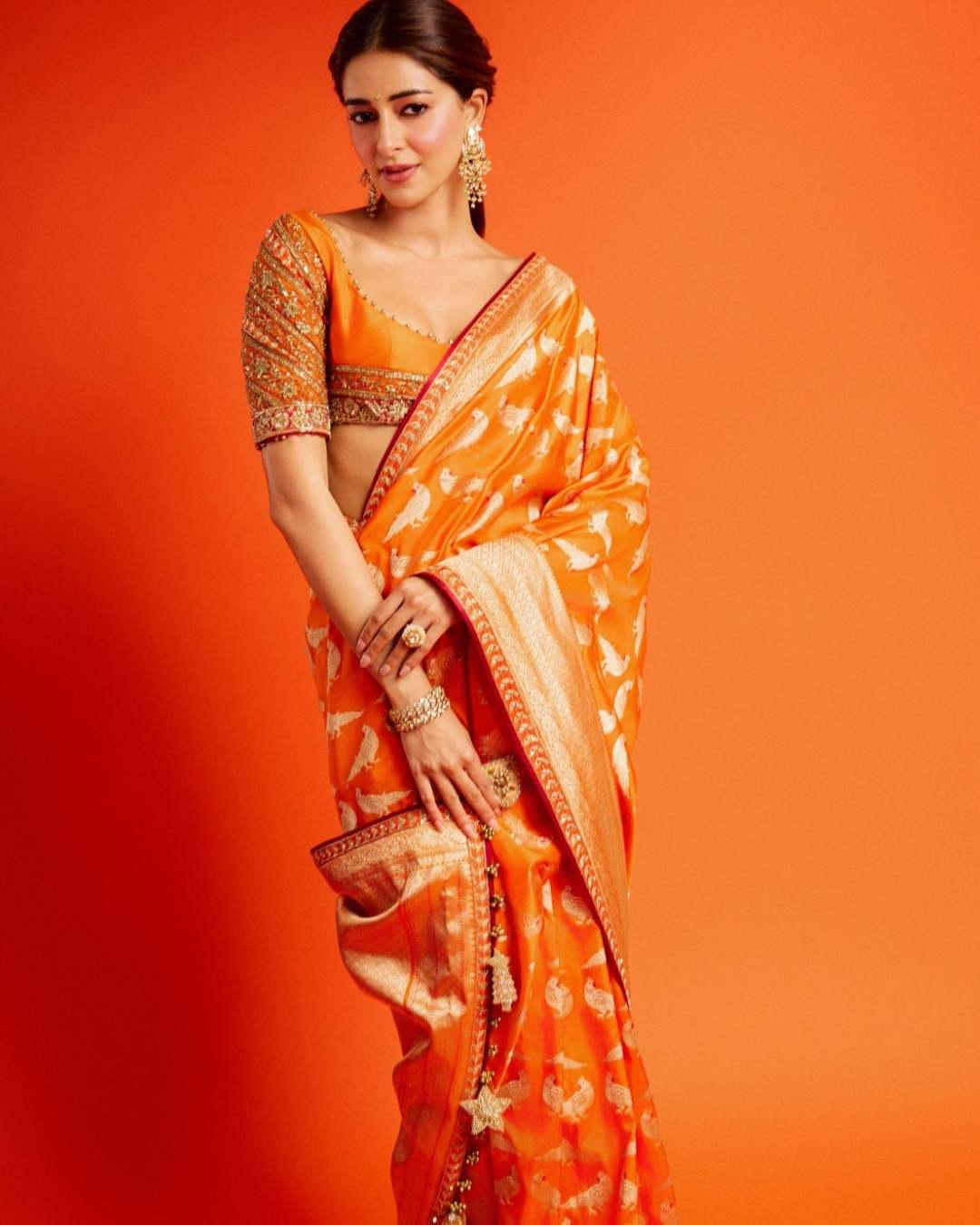 The 27-year-old actress accessorised the sari with statement earrings, skipping a necklace to allow the blouse’s flattering neckline and backless detail take centre stage. Peach-toned makeup, a loose hairdo and a crystal bindi completed Ananya’s look.