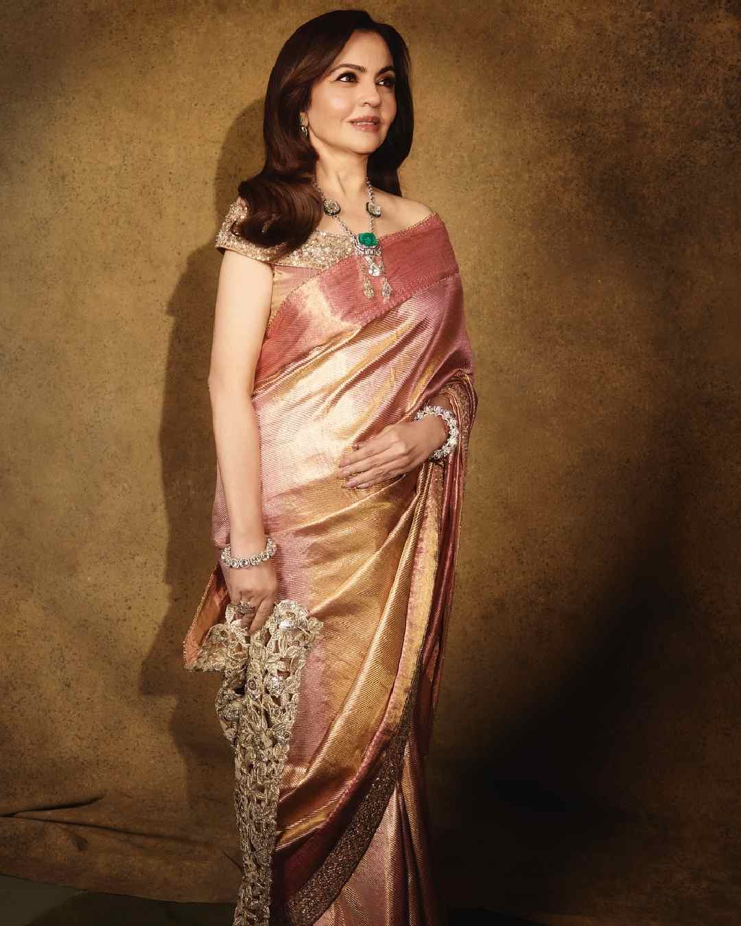 Nita Ambani stunned in a handwoven pink Kanjivaram sari from Swadesh at the inaugural British Museum Ball in London in October.
