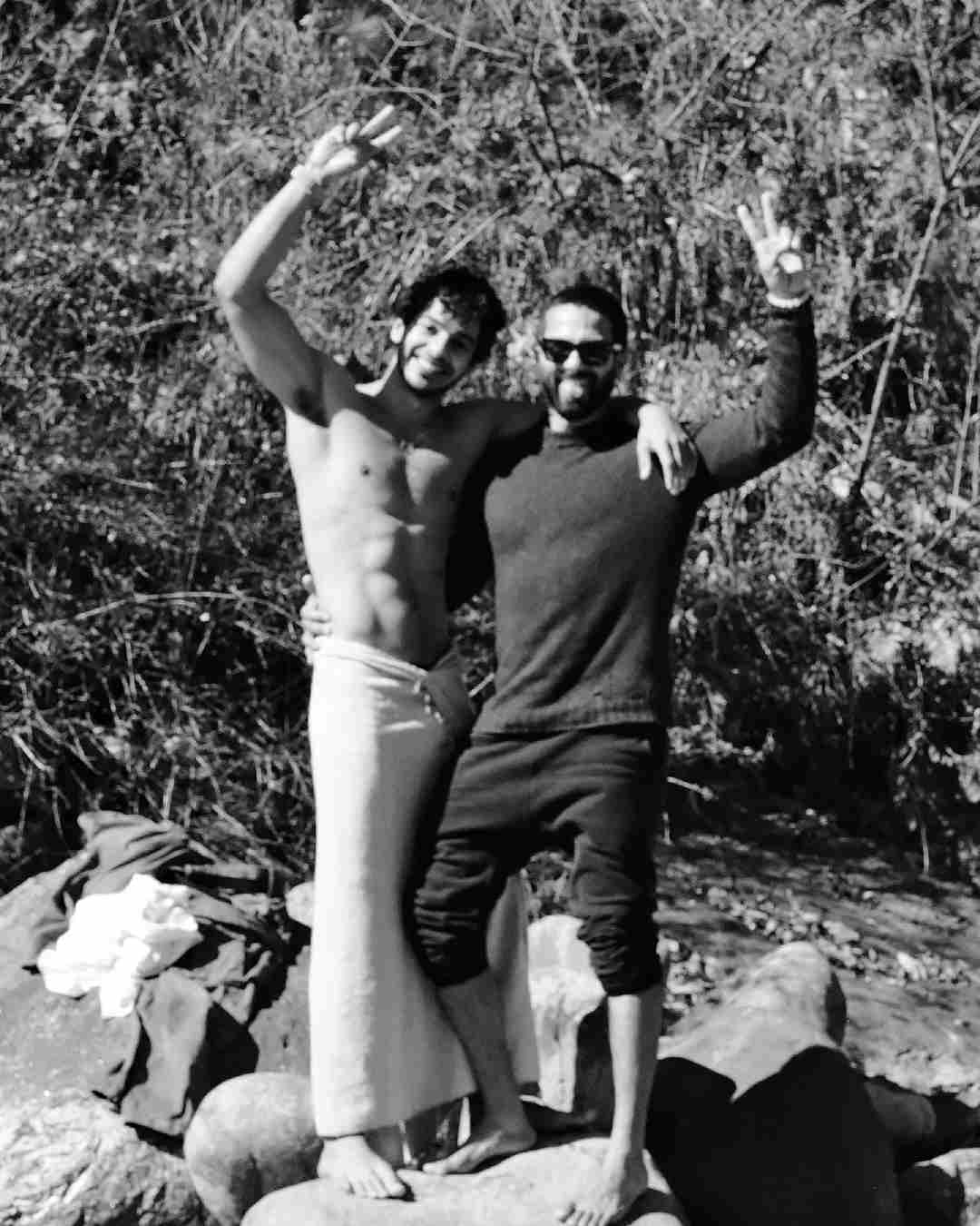 In a charming black-and-white photo, the brothers share a playful moment, posing quirkily on a giant rock.